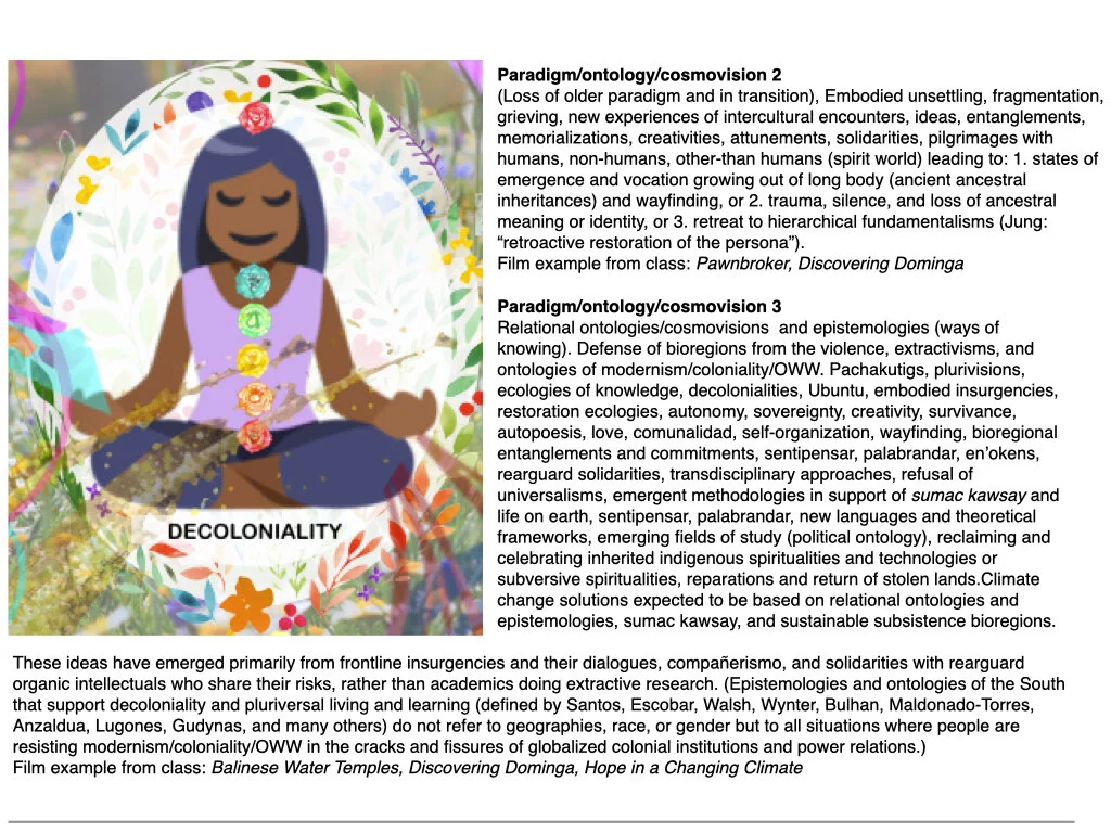 Ontologies are political because they are supported or suppressed based on hegemonic power structures. More and more local insurgencies are being organized around an awareness that we are fighting not only for single issue changes, but also for new ways of life and alternative worldviews that allow care for environments. Local organizations are forming innovative prefigurative collective projects through community gardens and kitchens, factory and land takeovers, cooperative workshops, and housing experiments. Huge coalitions have formed to advocate for different understandings in approaching governance, elections, environmental policy, and militarization. Movements of decoloniality are arising from below and linking globally to rethink together less destructive ways to live on earth as we race against climate c;hange that threatens to displace millions of life forms.